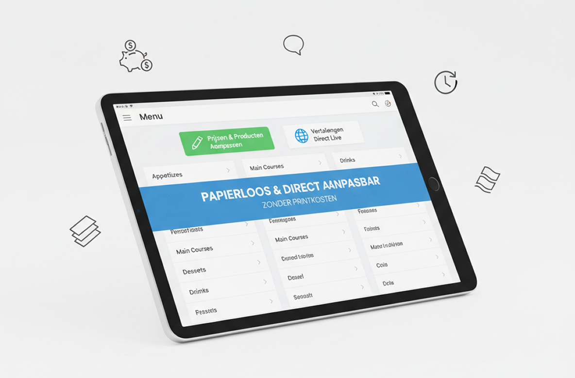 Menukaarten zonder printkosten. Pas prijzen, producten en vertalingen direct live aan.